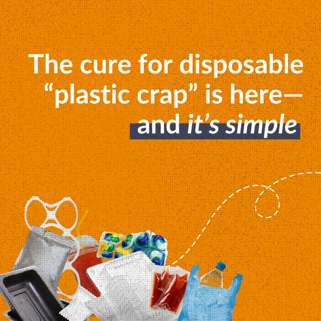 The science is clear that we can’t begin to address the plastic crisis without first drastically reducing the amount of plastic that gets produced in the first place — so much of which is, indeed, “crap” we don’t need. This is critical for the climate (since 99% of plastic is made from fossil fuels) but cutting production is equally important for our health. Because plastic truly is everywhere, including but not limited to breast milk, the brain and testicles — and with devastating health impacts.